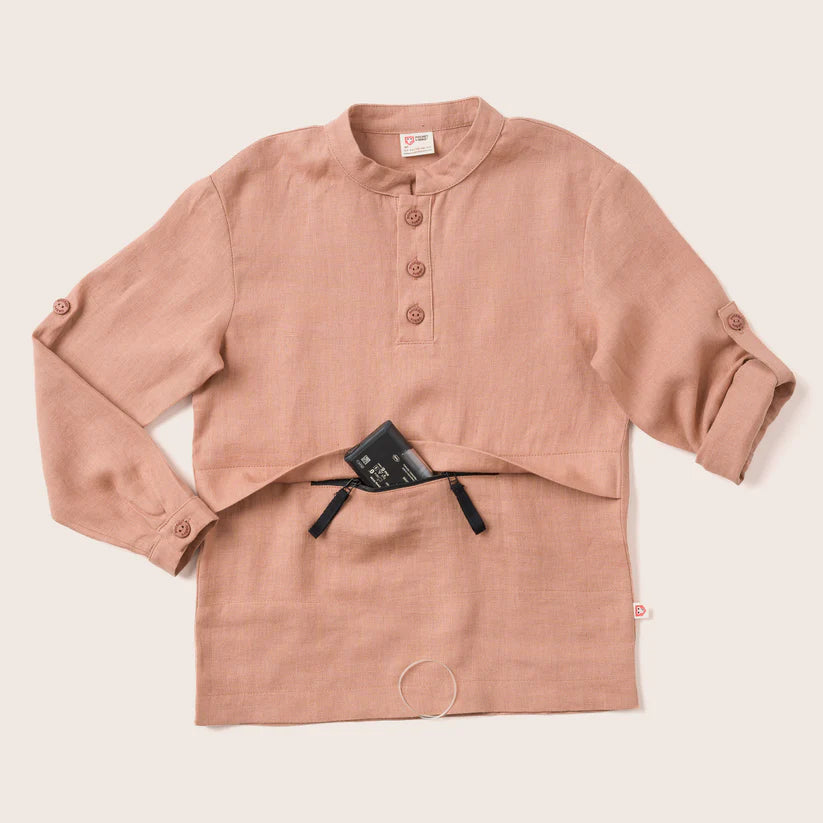 Introducing our Boys' Long-Sleeve Linen Shirt, a perfect blend of style and practicality, designed with the needs of kids managing T1D in mind. This shirt features long sleeves that can be easily rolled up and secured with a button, offering a versatile and stylish look for any occasion.