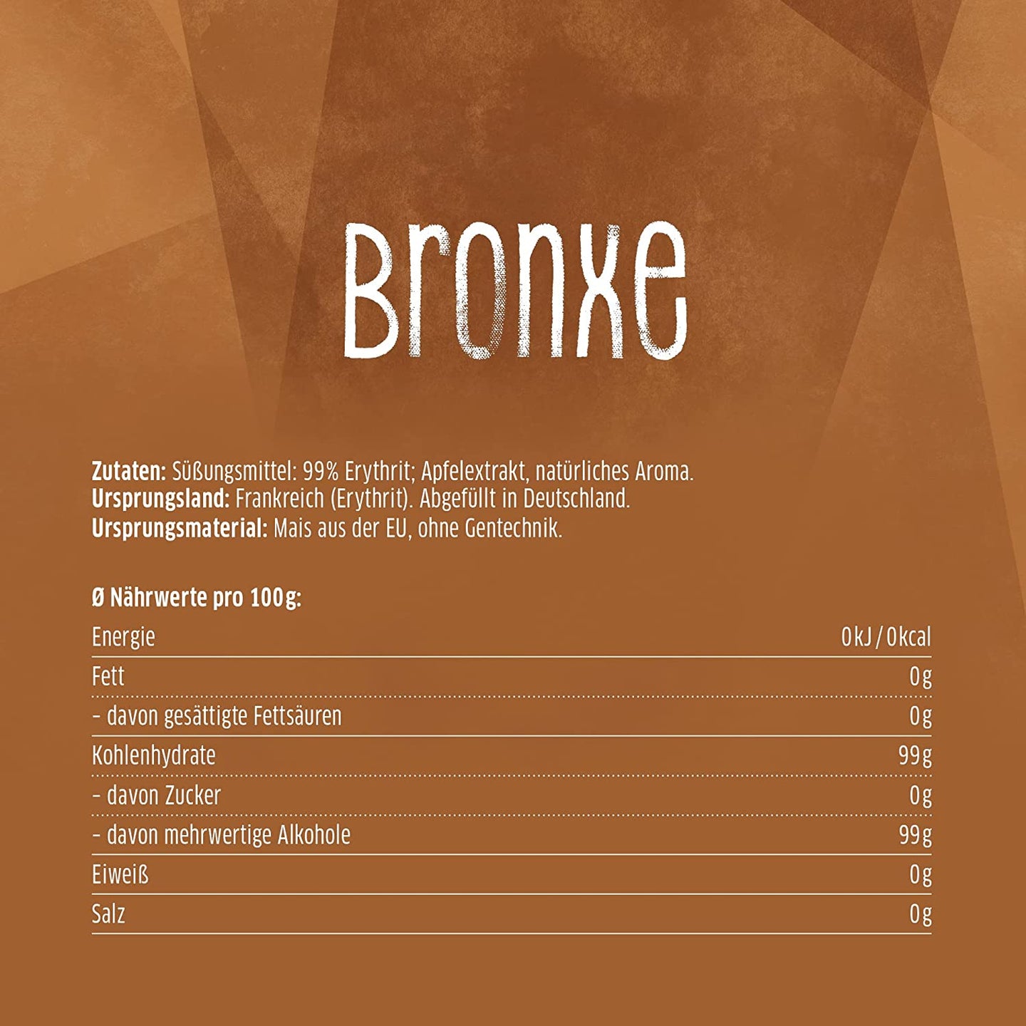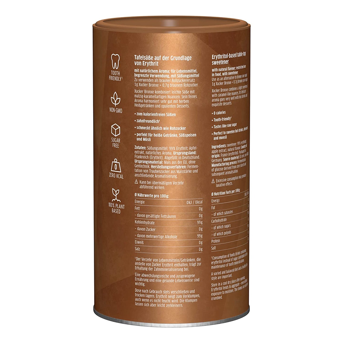 Xucker Bronxe brings the flavor of brown sugar into your home in a zero-calorie version! The sweetening power corresponds to about 70% of the sweetening power of raw sugar. The taste is mildly sweet and very similar to that of brown raw sugar. It is therefore very suitable for tea and coffee drinks. The flavor doesn't really come into play when baking, because you have to mix it with xylitol or sugar, otherwise it will crystallize.