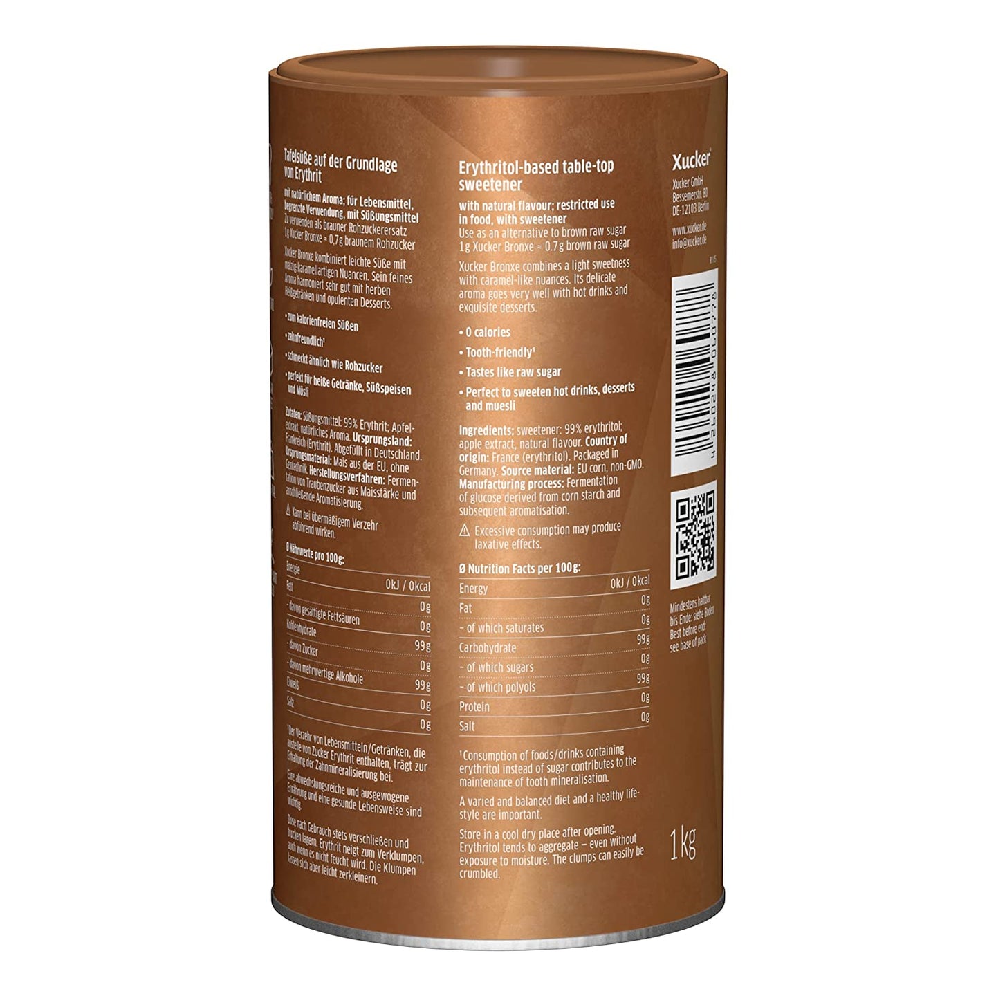 Xucker Bronze Erythritol 1kg Can - Calorie-Free Brown Sugar Substitute for Vegans and Tooth-Friendly Sweetening, Stevia-Free Erythritol