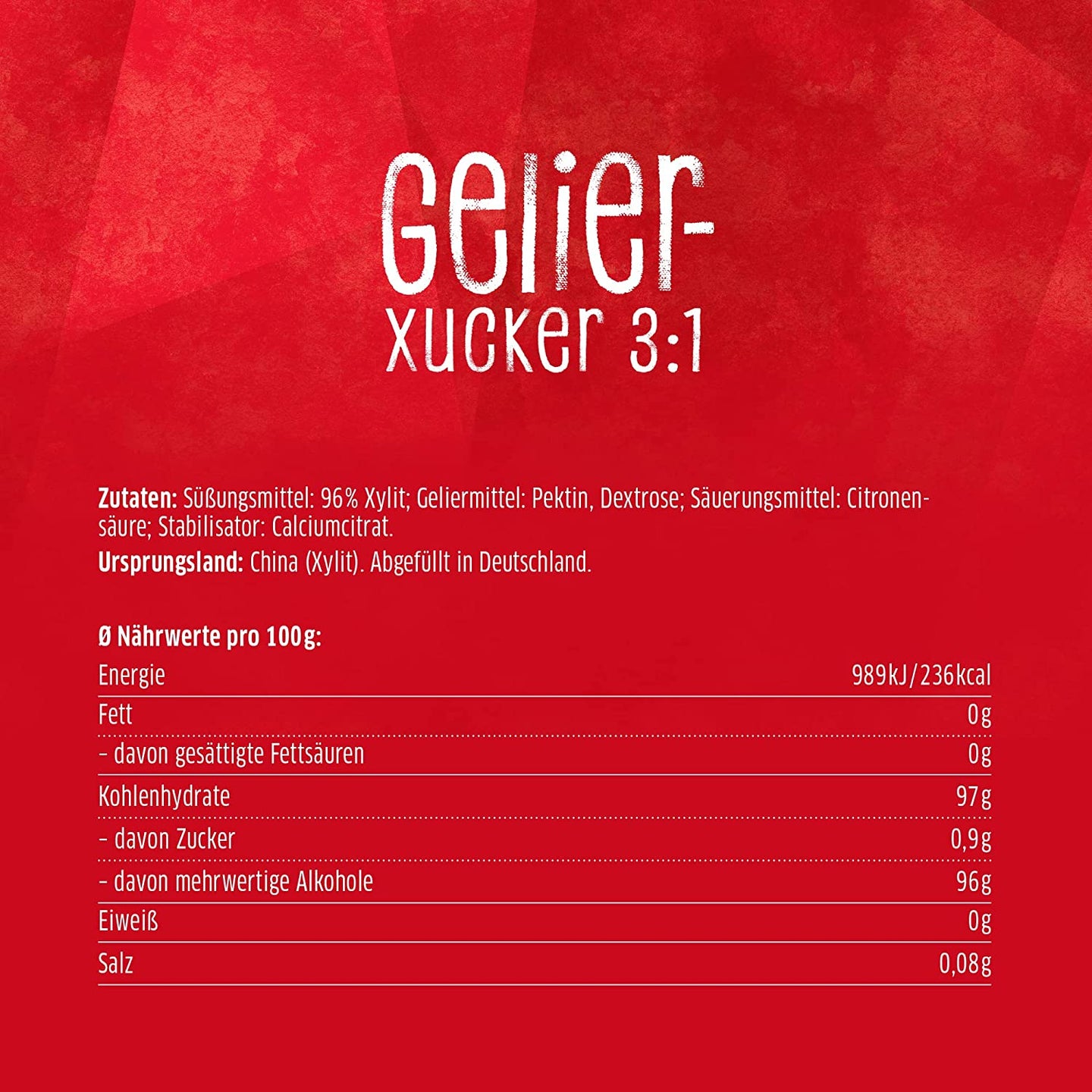 2:1 ready-mix for the production of 3 kg of jam (incl. instructions). This gelling sugar is particularly suitable for sour fruits that need a little more sweetness, such as jam with sour cherries, currants or gooseberries. You can make delicious fruit spreads and jellies yourself with the 2:1 ready-mix. Pectin and citric acid are also included for the perfect gelling result. You only need 2 kg of fruit. For jellies, 2:1 gelling sugar should be used in a 1.6:1 ratio.