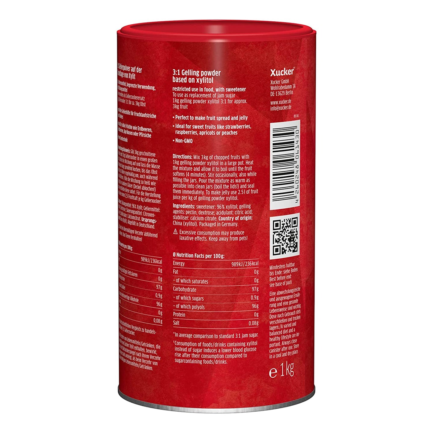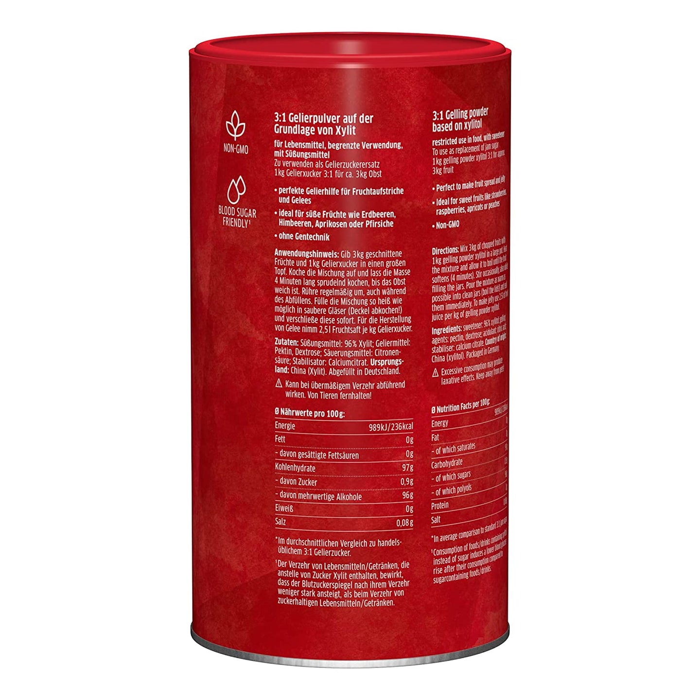 Instructions for use: 2:1 gelling sugar is to be used like 2:1 gelling sugar. Please stir the contents of the can well before use, this will distribute the pectin better and ensure a homogeneous mixture. Only use clean jars and boiled lids. Put 2 kg of clean, chopped fruit and 1 kg of gelling sugar in a large saucepan and let the mixture boil thoroughly until a layer of foam forms. Keep the heat high while stirring and let the mixture simmer for 3-4 minutes. Leave the pot on the stove with a low flame while filling and seal the jars immediately. Then turn the jars upside down and let them cool. In clean containers, the fruit spread can be kept for at least a year without refrigeration.