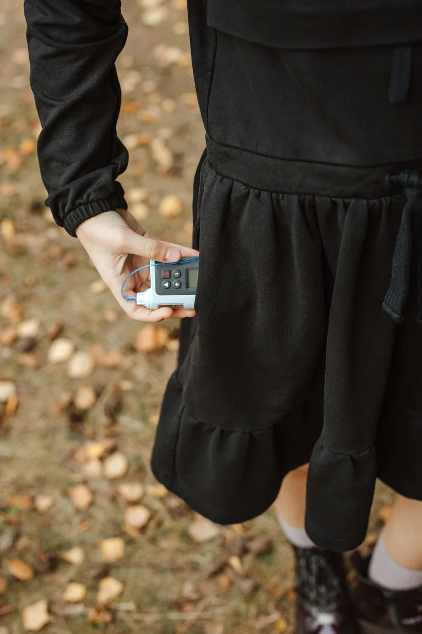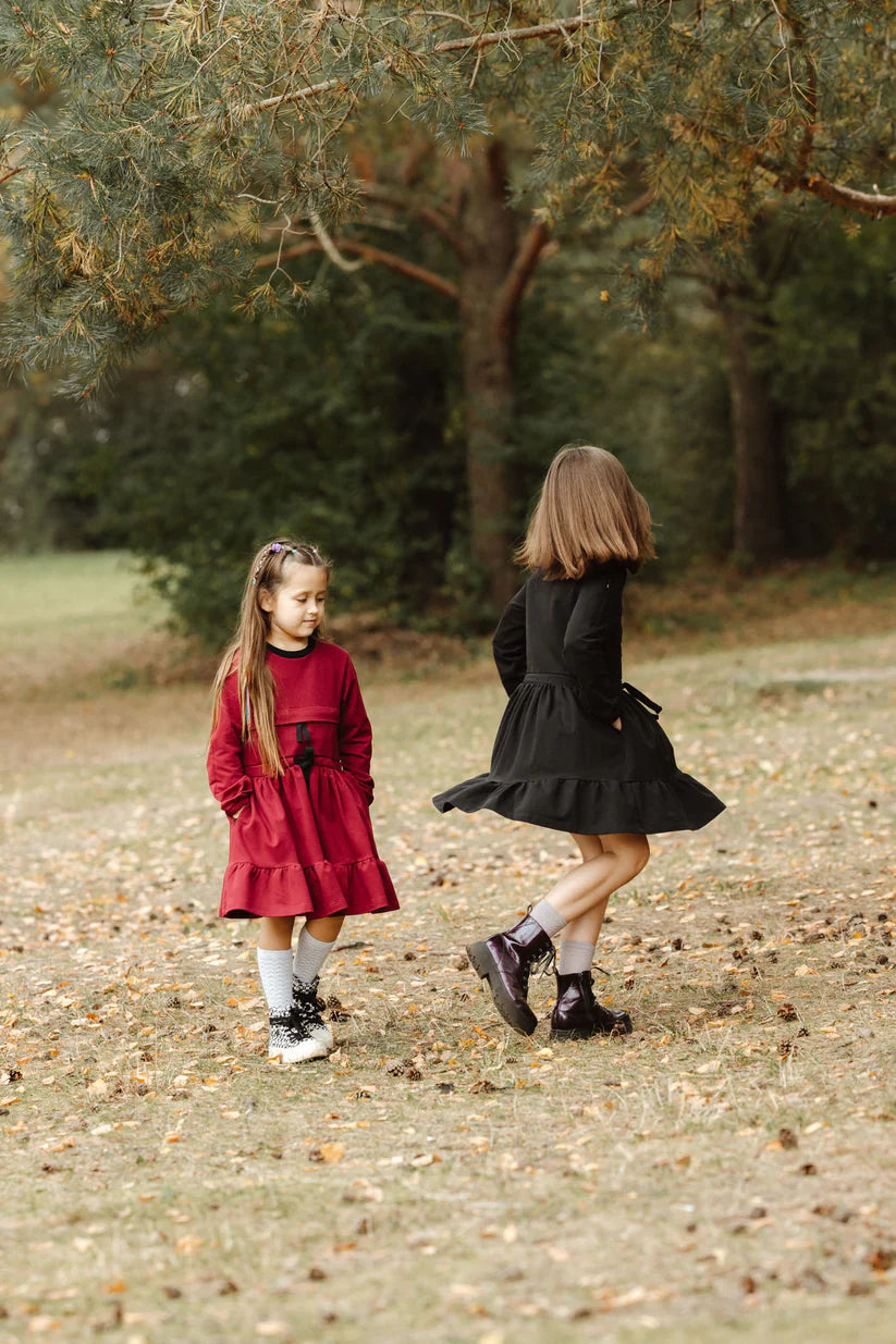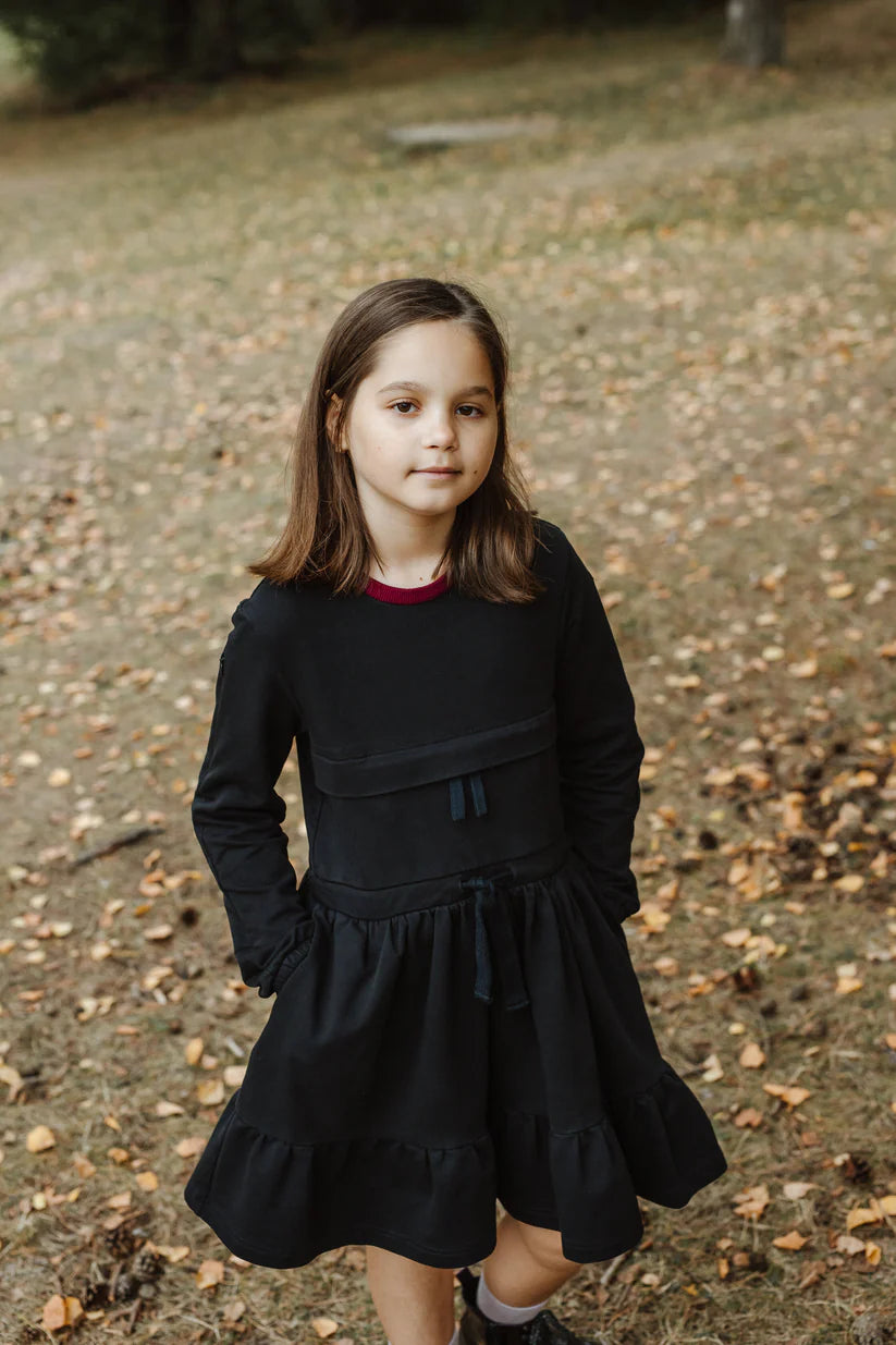 Afslør charmen ved 'BARBORA Black'-kjolen, der er skræddersyet til unge piger, der søger eventyr og stil. Denne dejlige langærmede, A-line snoede kjole kombinerer mode med praktisk, hvilket gør den til et fremragende valg til daglig brug. Dens iøjnefaldende funktion er den smart integrerede brede dobbeltsidede frontlomme med dobbelt lynlås, perfekt til at gemme små skatte eller væsentlige ting. Plus, to ekstra sidelommer forbedrer tilgængeligheden og passer problemfrit ind i dets design. Det er mere end bare en kjole; det er en erklæring om legende elegance og smart funktionalitet, udformet til at lade din datter snurre rundt med glæde og selvtillid. Lavet af blødt, åndbart bomuld, er 'BARBORA Black'-kjolen designet med komfort og stil i tankerne, som lover at være en værdsat tilføjelse til enhver ung piges garderobe.