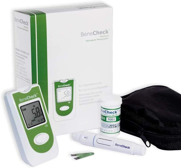 Kit de măsurare a acidului uric BeneCheck Premium - Include carcasă, dispozitiv de injectare, lancete și 10 benzi de testare
